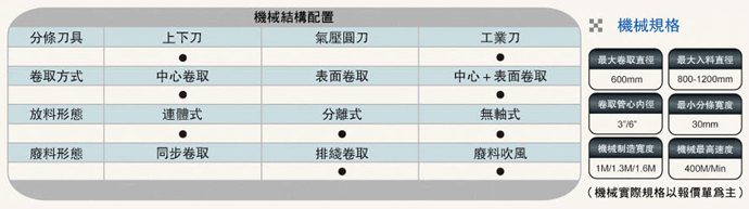 成品卷取方式:滑差式卷取軸,適用更多材料,換軸方式經(jīng)特殊設(shè)計,可以隨時更換。