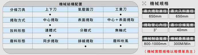 基本放料形式:連體式活動機(jī)座,加裝自動對邊裝置,成品邊面整齊,生產(chǎn)順利。